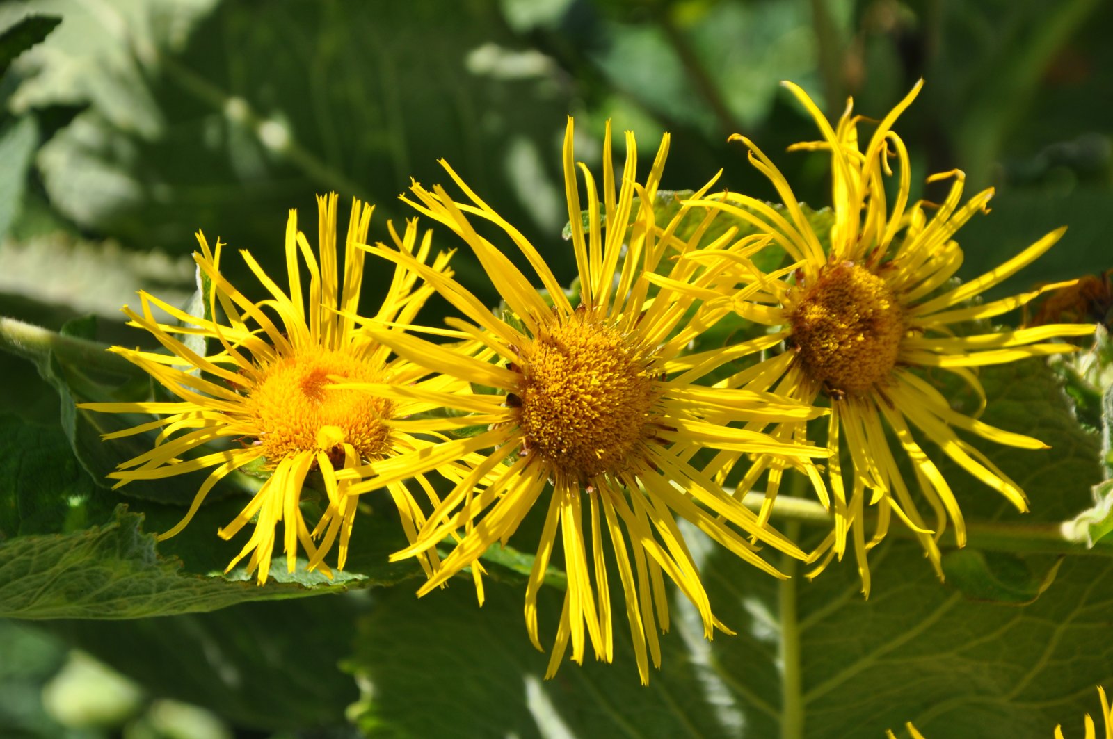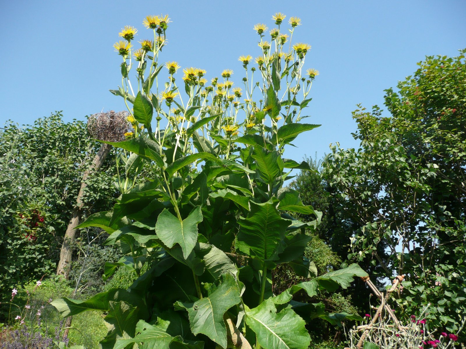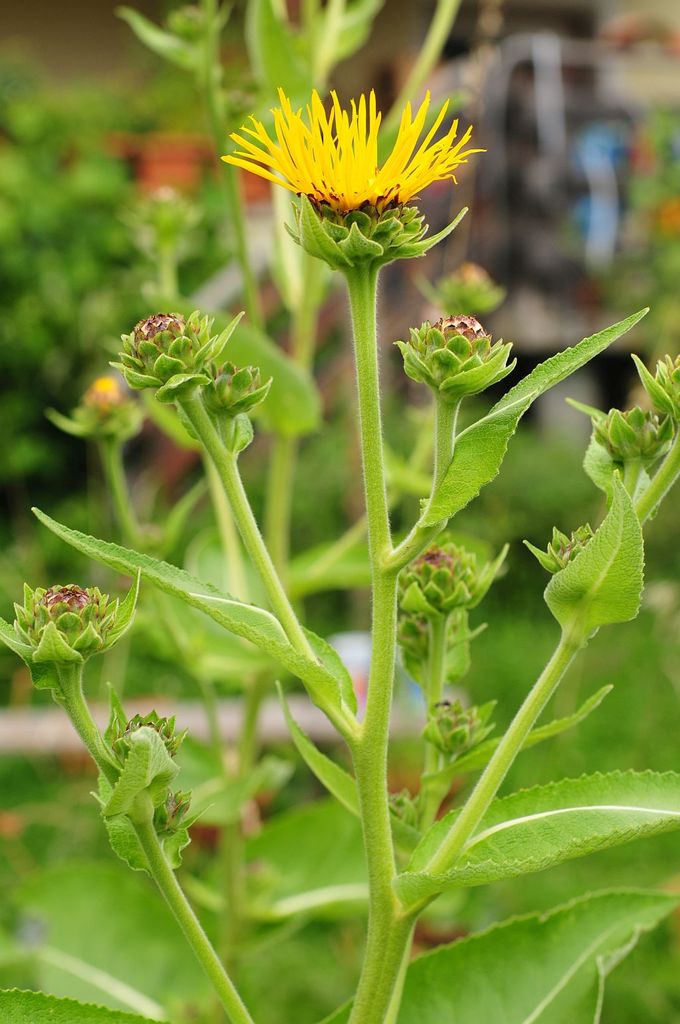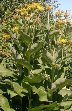 Großstaude der Korbblütler/ Asteraceae. Heilpflanze aus West- und Mittelasien, vielfach eingebürgert. Ca. 2m hoch, große lanzettliche Blätter. Verwendung der Wurzel bei Keuchhusten, Asthma, Verschleimung, als Magenmittel. Sie enthält Inulin und besitzt starken Veilchenduft! Gelbe Blütenkörbe mit schmalen flatterig abstehenden Zungenblüten. Nach der Blüte ganz zurückschneiden oder Samen ernten.